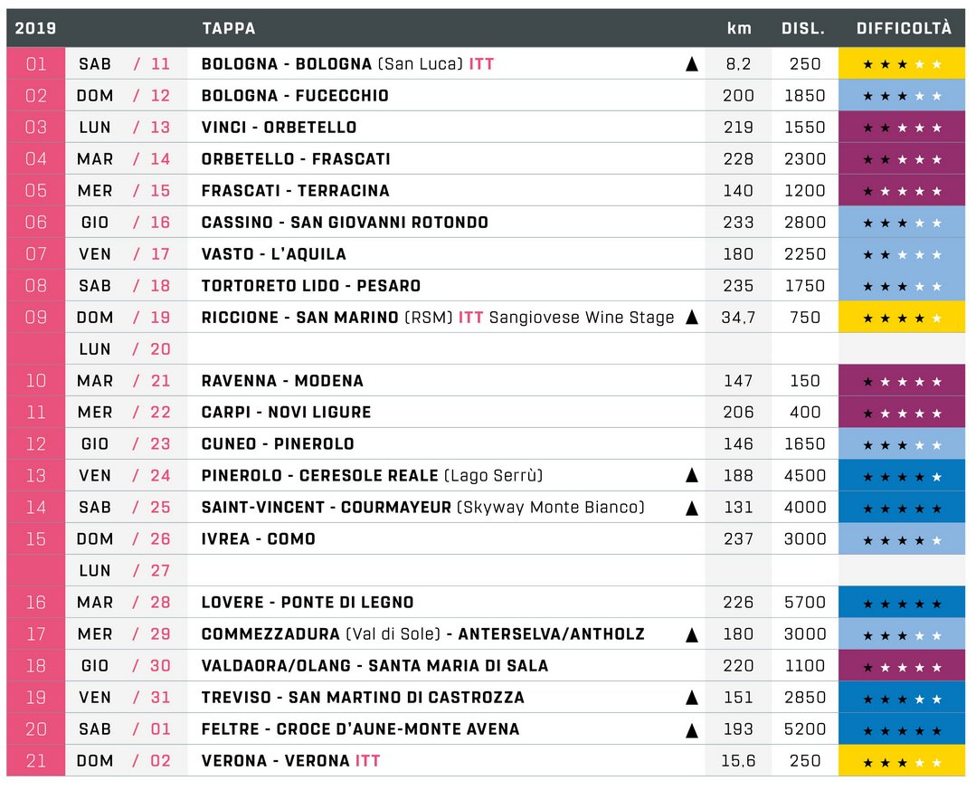 en Bolonia y San Marino. La Cima Coppi será el Paso Gavia con sus 2.618 metros,